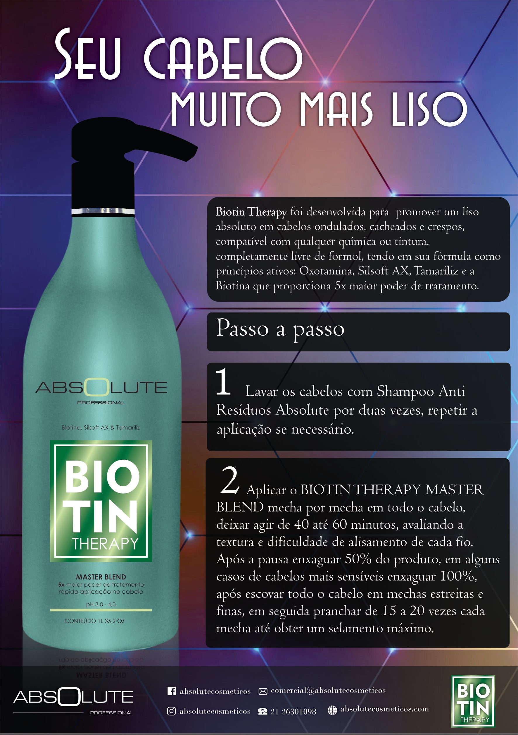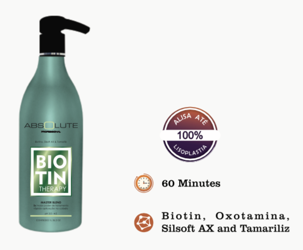 Biotin Therapy has been developed to promote an absolute straightening in wavy, curly and coily hair, compatible with any chemistry or hair dye, completely Formaldehyde-free. It has as principle actives at its formula: Oxotamina, Silsoft AX, Tamariliz and Biotin, wich provides 5x greater power of treatment.